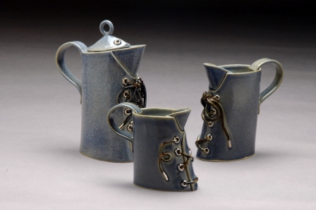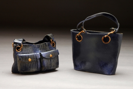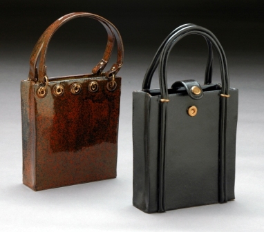 Janet Halligan graduated from Stourbridge College of Art in 1970. She lived and worked on the South Coast until 1984 when she set up a workshop near Nantwich. Trompe I'oeil ceramics such as bags and shoes are slab-built and glazed using a range of stoneware glazes and metal lustres. There is also a developing range of hand-built vessels featuring some of the elements found in the realistic work such as buttons, laces and zips. She is a Professional member of the Craft Potters Association of Great Britain. |