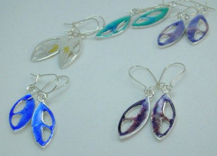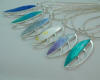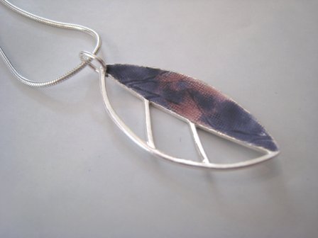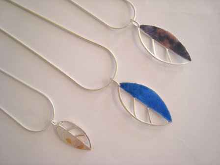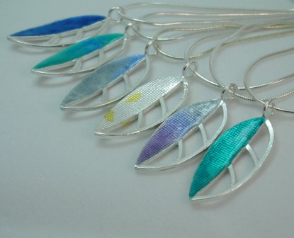 I take small sheets of freshly anodized aluminium, dye it and add patterns to it. I work on a sheet approximately 240x160mm. Sometimes I draw lines of colour on directly and sometimes I add patterns using the resist method. I typically might dip a sheet part of the way in to one colour, rinse it and then fully submerge it in another colour. I then cut and texture the sheet by passing it through rollers together with woven textile. Because these hand patterned, dyed and cut each piece will be individual and I can avoid making any two pieces identical to each other. - Lynne Glazzard |