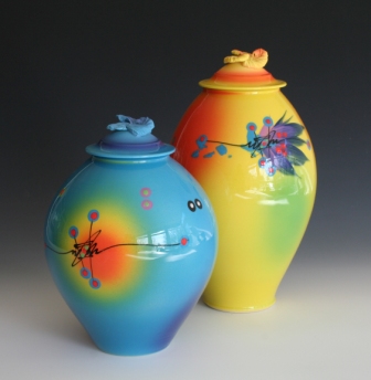 Richard gained a degree in ceramics from Bristol Art College in 1972 and then taught for eight years before starting his first full time studio. He is a fellow of the CPA and he is well known internationally for his pioneering development of brightly coloured slips and his use of innovative construction techniques. His unique style makes his work highly collectable and he has pieces in major public and private collections around the world. He lectures and exhibits all over Europe and has been the subject of two television documentaries. He recently won the bronze award at the European Ceramics Competition in Athens, which was held to celebrate the opening of the 2004 Olympic Games. |