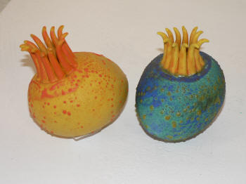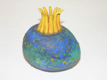 Catrin Mostyn Jones Catrin’s work is inspired by exploring creatures of the sea and images of the human body at a microscopic level. Examining the complex and colourful images derived from these studies has given Catrin the stimulus to develop and explore differing combinations of form and colour.Catrin’s vivid collection of hand built and press moulded sculptural forms are brought to life by the additional growths using coils and textures. Her work is predominantly non-functional or it could be said that some of her pieces are functional with a twist. What really brings the work alive though is her glazing, through a wide range of low fired earthenware glazes applied by spraying multiple layers sometimes using a ax resist. The resulting effect has been described as “a sensual, evocative and organic burst of coral reef colour and texture.” | ||||||